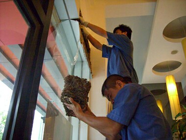 佛山益伦白蚁防治公司的工作人员在南海松岗的某家餐厅取出白蚁巢,“端”出的同时,还发现有数个小白蚁群。